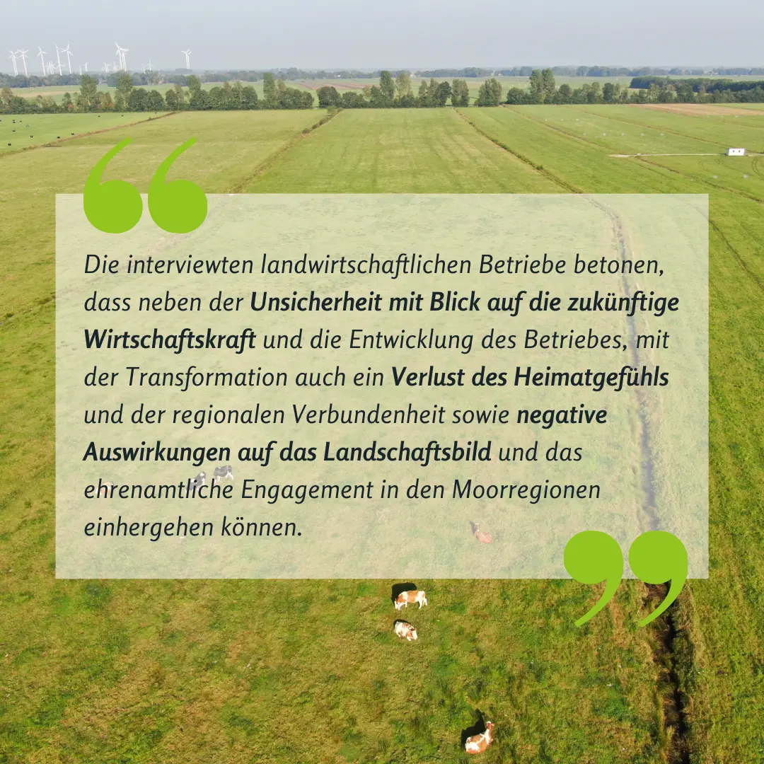 Die Transformation der Moore birgt wirtschaftliche und soziale Unsicherheiten sowie potenzielle Verluste für betroffene Akteure. Wichtige Aspekte sind z. B. der Verlust des Heimatgefühls und die Beeinträchtigung des Landschaftsbildes, was wiederum Auswirkungen auf das ehrenamtliche Engagement in den Regionen haben kann. Betroffene Betriebe und Akteure äußern zudem Bedenken hinsichtlich der zukünftigen Entwicklung und der ökonomischen Tragfähigkeit der neuen Nutzungsformen wie bspw. Paludikulturen.