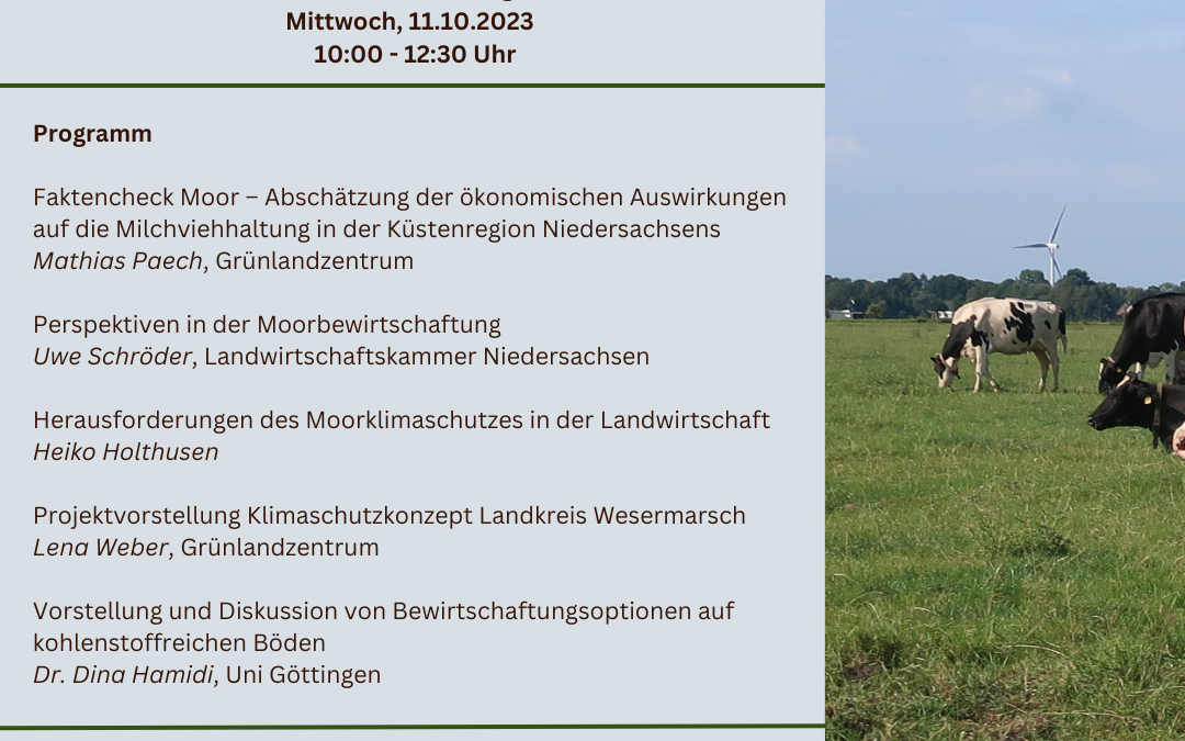 Auf dem Programm stehen u. a. die Vorstellung des Projektes und des Faktenchecks Moor. Während Heiko Holthusen über die Herausforderungen des Moorklimaschutzes in der Landwirtschaft spricht, widmet sich Uwe Schröder von der Landwirtschaftskammer Niedersachsen den Perspektiven der Moorbewirtschaftung. Gemeinsam können dann Bewirtschaftungsoptionen auf kohlenstoffreichen Böden diskutiert werden.