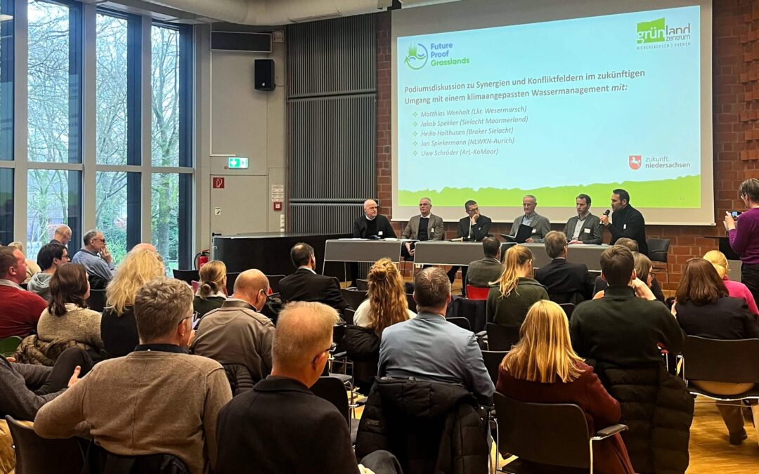 Den Abschluss der Konferenz bildete eine Podiumsdiskussion, bei der Synergien und Konfliktfelder im zukünftigen Umgang mit einem klimaangepassten Wassermanagement diskutiert wurden. Zu den Teilnehmenden zählten Matthias Wenholt (Umweltdezernent, Landkreis Wesermarsch), Jakob Spekker (Verbandsvorsteher Sielacht Moormerland), Heiko Holthusen (Verbandsvorsteher Braker Sielacht), Jan Spiekermann (Niedersächsischer Landesbetrieb für Wasserwirtschaft, Küsten- und Naturschutz, Aurich) und Uwe Schröder (Leiter Koordinierungszentrum Moor).