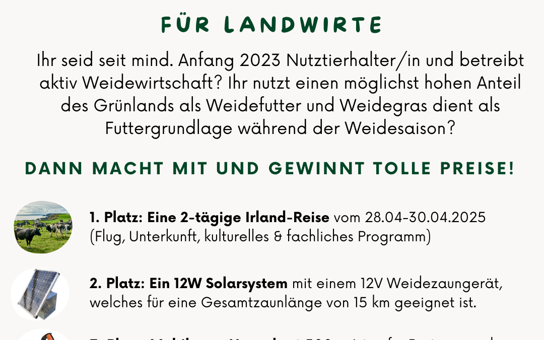 - Platz: Eine 2-tägige Reise nach Irland zur Grazing4Agroecology-Award-Verleihung vom 28.04-30.04.2025 (Flug und Unterkunft, kulturelles und fachliches Programm). Die Reise umfasst Besichtigungen von landwirtschaftlichen Betrieben sowie die Möglichkeit, sich mit den Gewinner-Landwirten aus 8 verschiedenen EU-Ländern auszutauschen. Die Preisverleihung umfasst eine Urkunde, die in Kooperation mit dem Teagasc, dem nationalen landwirtschaftlichen Forschungs- und Beratungszentrum Irlands (https://www.teagasc.ie/), bereitgestellt wird sowie die Möglichkeit, den eigenen Betrieb im Projekt Netzwerk zu bewerben.